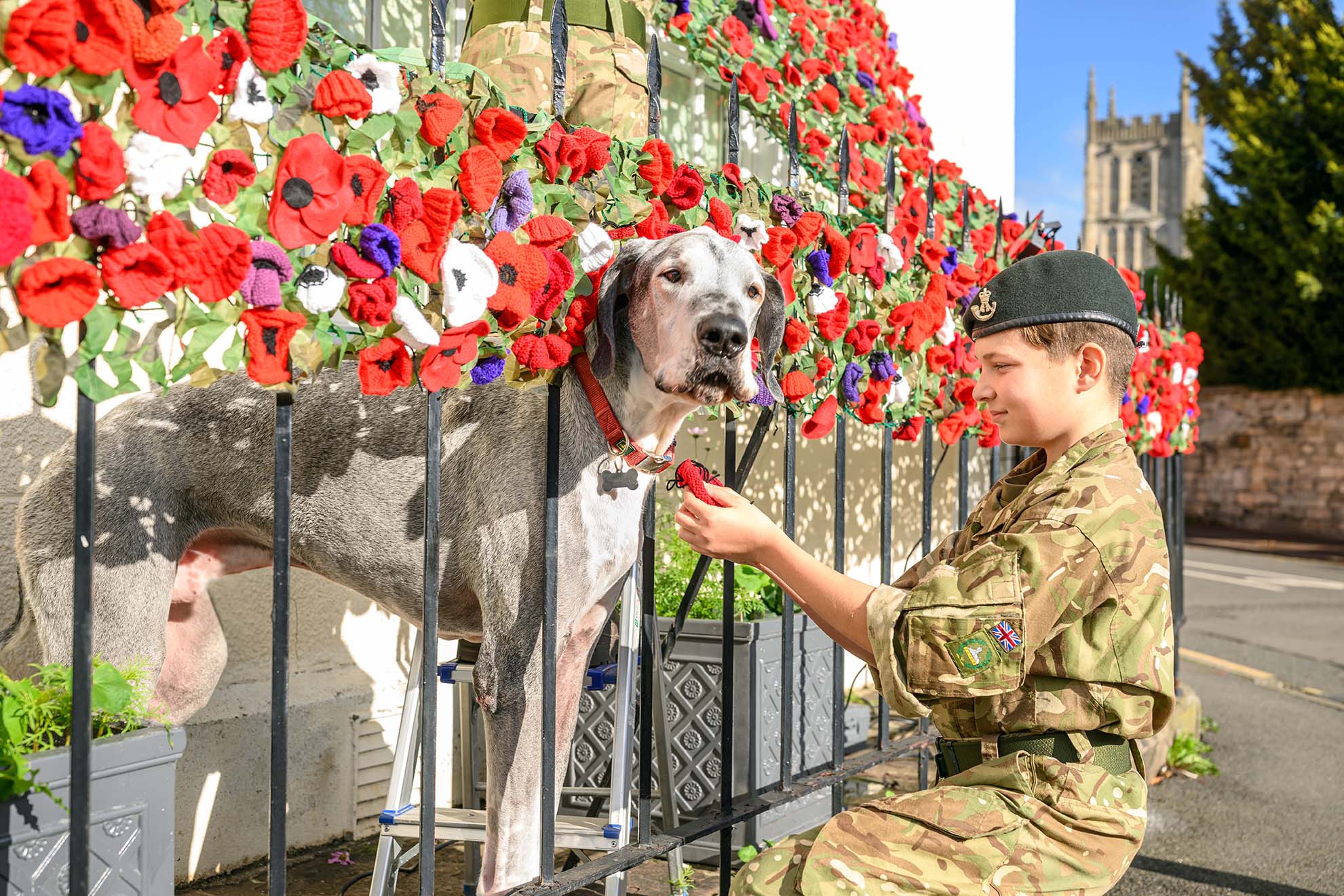 A Sunday Times P2 of Zalan Kiss from Gloucestershire Army Cadet Force (Wotton-under-Edge Platoon) helping to assemble a poppy cascade at 1 Old Town the home of Victoria Edwards who received knitted poppies from around the world after placing an appeal on a knitting facebook page, ahead of the Cotswold Town's remembrance parade.